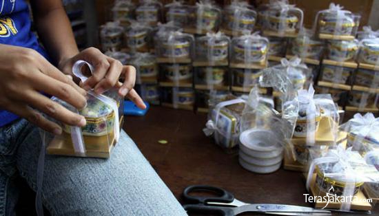 Seorang pedagang sedang membungkus souvenir penikahan yang akan dijual ataupun pesanan dari pelanggangnnya.